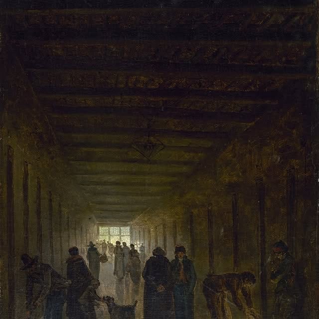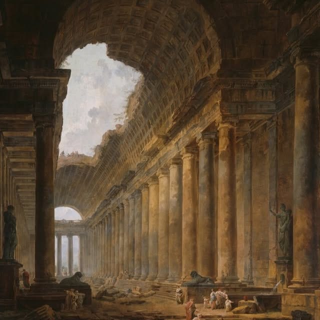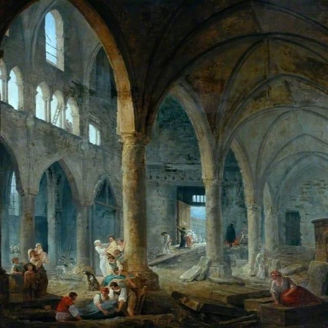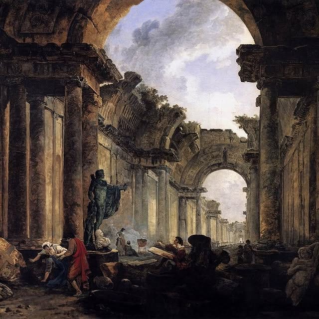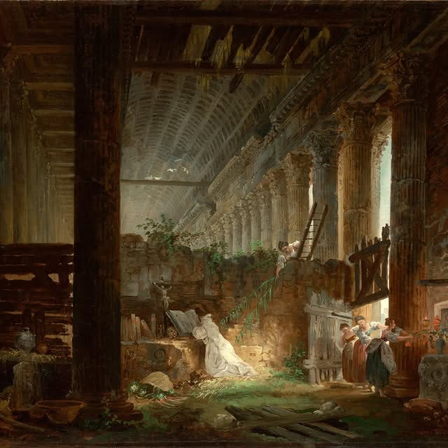 Sus capriccios ahora imaginaban edificios contemporáneos, como el propio Louvre que administraba, en ruinas, con el techo caído y personas explorando, cocinando o tomando cobijo en sus escombros. Quizá dentro de la sensación de colapso que se le había quedado en el alma apesadumbrada aún permanecía cierta dulce melancolía, en la exposición de seres humanos manteniendo humildemente el correr de la vida entre las grietas de un mundo que creyó en su grandeza y ahora se encuentra extinto. Más que ser las viejas figuras graciosas y anacrónicas al estilo de su amigo Fragonard, que corrían entre sus ruinas en sus trabajos juveniles, estos grupos terminan siendo representación del último reservorio de cultura tras un desastre mundial no identificado.